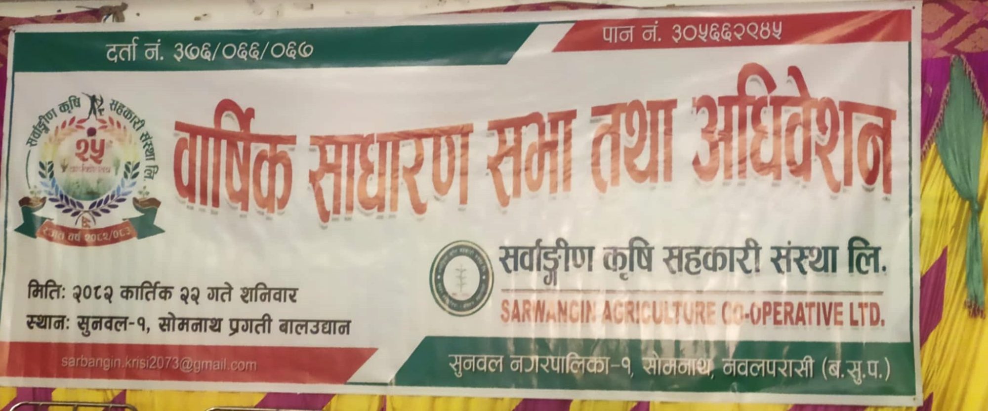सुनवल ।  सर्वाङ्गीण कृषि सहकारी संस्था लि.को २५ औं वार्षिक साधारण सभा तथा अधिवेशन प्रगति बाल उद्यान, सुनवल–१, सोमनाथमा सम्पन्न भएको छ। सभा अध्यक्ष खगराज उपाध्यायको अध्यक्षता तथा सुनवल नगरपालिका–६ का वडा अध्यक्ष हिमलाल शर्मा चापागाईको प्रमुख आतिथ्यमा सम्पन्न भएको हो।